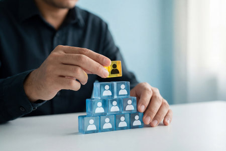 A professional businessman carefully places a yellow cube featuring a leader icon onto the top of a pyramid of blue employee blocks to symbolize promotion and successful team management strategies.