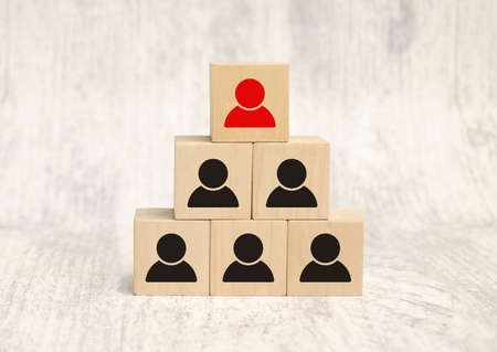 Pyramid of wooden blocks with blue figure icons and red icon on top, team lead or business management success concept, 3D illustration