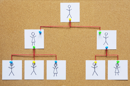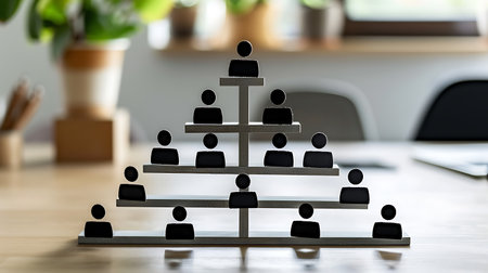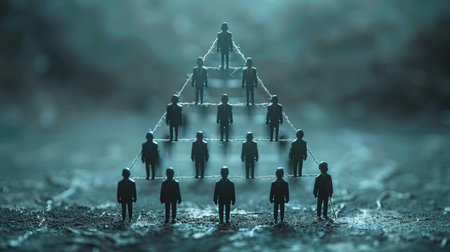 Miniature figures arranged in a pyramid formation representing business hierarchy and teamwork. Symbolizes leadership, organization, and corporate structure.