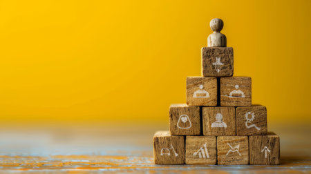 Wooden pyramid composed of blocks with business icons representing hierarchy, teamwork, and success on a yellow background.