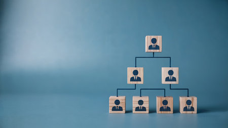 Organizational chart with human resource manager's hand placing wooden piece, concept about career, the ladder of success, hiring, higher job or position. HR organigram, professionnal organization