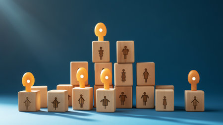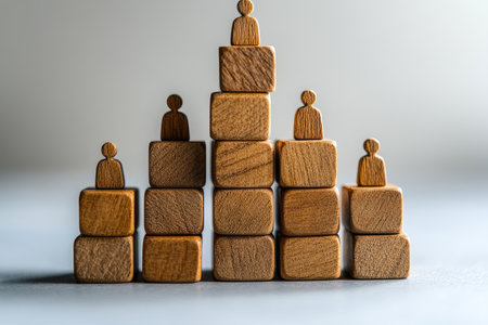 Wooden blocks with human icons stacked on top of each other to form an abstract mountain or podium, representing the process and steps in building high-performance employee models for college auditoriums. White background, simple minimalist style. --ar 3:2 --stylize 750 --v 6.1 Job ID: e32aa134-9b44-4d7e-87ba-333dfa06d903