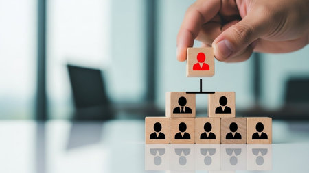 Leadership and human resources conceptual image - male hand structuring people icons on steps placed in pyramid position.