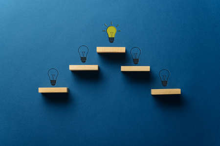 Wooden pegs placed in pyramid structure with light bulb drawn on top of each and the top one glowing. Over navy blue background.