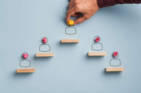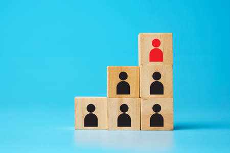 Hand putting manager icon on top of wooden stacking of staff icons for promotion leadership and teamwork concept.