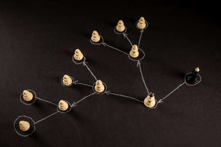 3D illustration of many pawns and golden organizational sheme over black background. Company hierarchy concept.