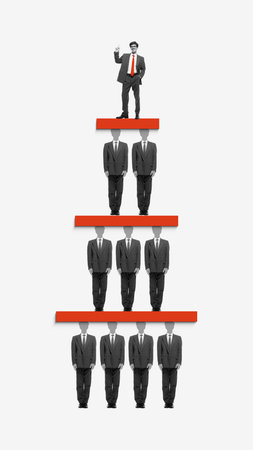 Surreal collage. Business hierarchy pyramid with leader standing on top red platform