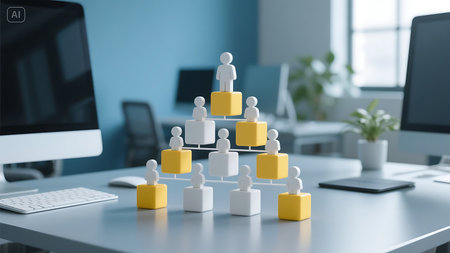 A conceptual image of tiny business figures arranged in a pyramid, symbolizing hierarchy and teamwork in a corporate setting.