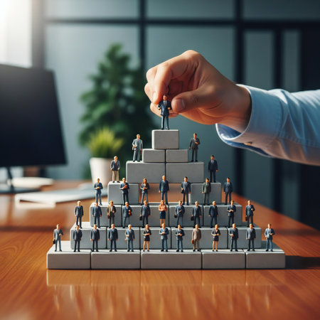 A hand placing miniature figures on a stack of blocks, illustrating the construction of a corporate hierarchy or team structure.