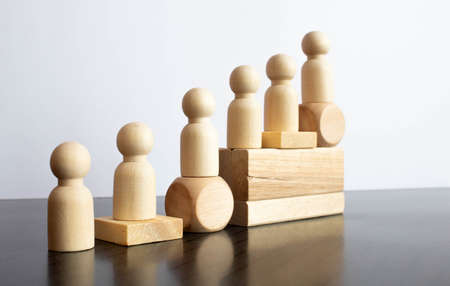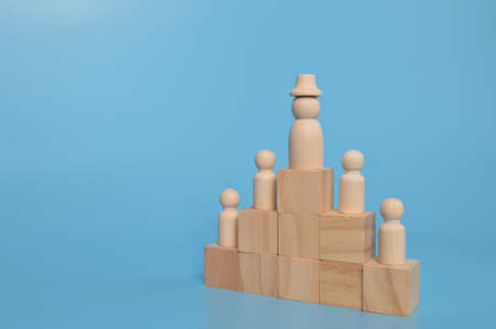 Wooden doll figures of businessman and office workers standing on wooden blocks. Concept leader of the business team