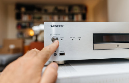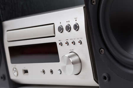 Modern Hi-Fi stereo amplifier tuner with CD tray open as seen from lateral low angle