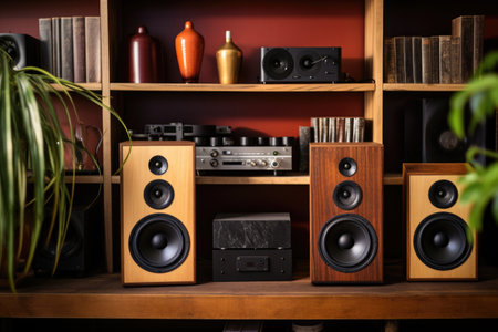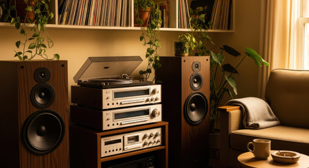 Cozy living room with vintage stereo system and wooden speakers surrounded by plants