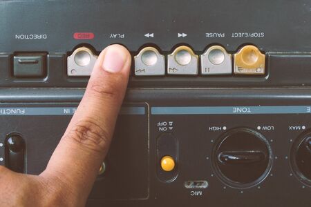 There is an old retro tape recorder on grass. Woman presses play button. Concept of old school vintage technique of the last century