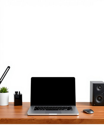 Workstation with speakers and computer in studio. Desktop in home office. Selective focus on the speaker.