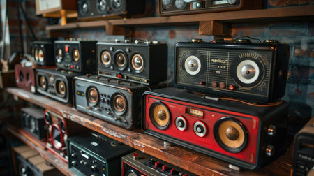 Vintage old timer radios stacked on a shelf. Flea market style collection of a retro car stereos.