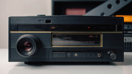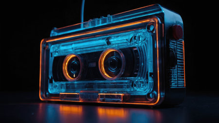 Black cassette tape lying on a surface, with a retro stereo system glowing softly in the background for a moody, vintage feel.