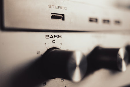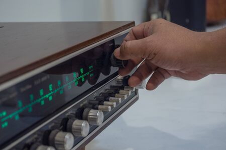 Amplifier button control of audio system for music background style in dark tone and soft focus.