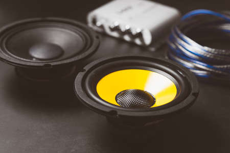 The black audio loudspeaker with yellow diaphragm. audio equipment concept.