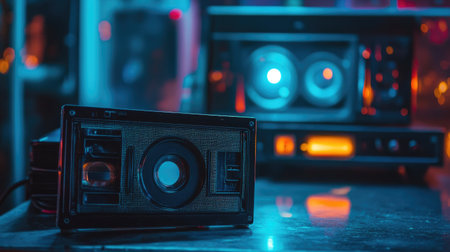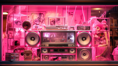 Vibrant photography of a boom box against a neon lights backdrop creating an energetic atmosphere