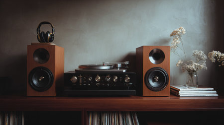 Experience the harmony of vintage audio equipment in a modern living space, featuring a turntable, stylish speakers, headphones, and thoughtful floral decor.