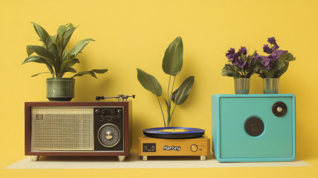 A vintage-style, retro-colored record player and an electric-blue vinyl turntable with a wooden speaker system, both displayed on white surfaces against a yellow background. The left side features the radio in its original wood-paneled Harley solid brown finish, showcasing two large black buttons for play and operator mode. On the right is a turquoise cabinet that contains three green leaves and purple flowers, adding to the overall aesthetic appeal of these products. --chaos 30 --ar 16:9 --v 6.1 Job ID: b35e5f5a-db0f-4831-914f-51ebd1893dd3