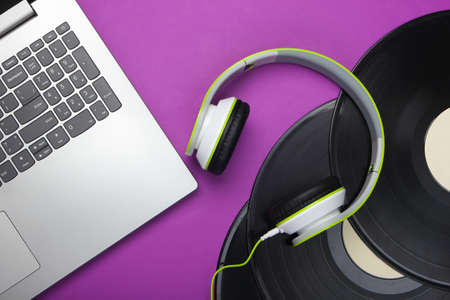 Laptop with headphones, vinyl records on purple background. DJ concept. Top view. Flat lay