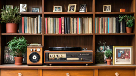 A cozy vintage scene showcasing a turntable with vinyl records on a wooden bookshelf, surrounded by potted plants and nostalgic decor elements. Perfect for music lovers.