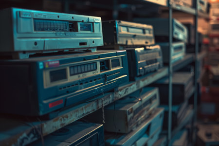 Retro Music Player in Vintage Record Store with Classic Albums. Concept of retro cassette tape player, music memorabilia, historical soundtracks, and cultural nostalgia.