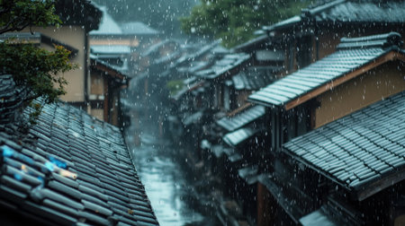 Rain splashing on traditional Japanese rooftops, water beads falling gently, moody blue hues and a touch of melancholy