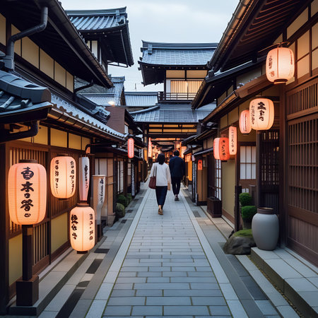 A couple walks down a traditional Japanese street lined with wooden buildings and glowing lanterns, illuminated by evening light.