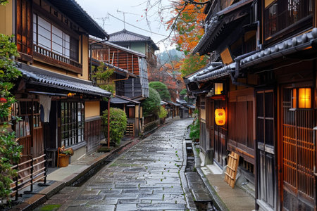 A serene, rain-slicked alley in Kyoto, Japan, lined with traditional wooden houses and scattered autumn leaves. The scene evokes a sense of tranquility and old-world charm.
