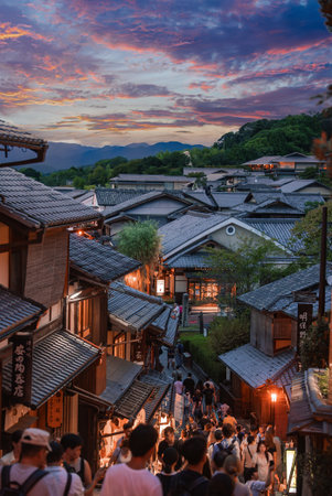 Twilight crowds in Kyoto Higashiyama with Yasaka Pagoda view