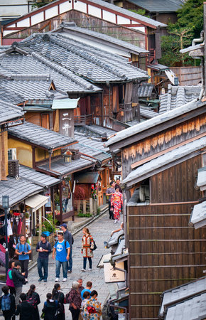 Kyoto, Japan- 24 Nov, 2019: Unidentified people stroll Ninenzaka street in Higashiyama. Higashiyama has Gion and Kiyomizu temple and is one of the most visited historic area in Japan.