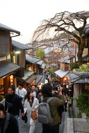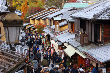 Kyoto, Japan - 25 November 2024: Crowd of tourists in Ninenzaka street leading to Kiyomizu-Dera temple