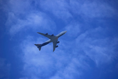 Under view of airplane flying. Commercial airline flying on blue sky