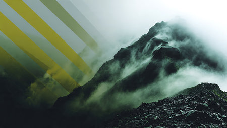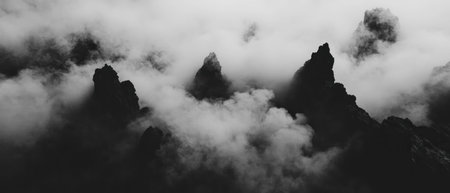 Ethereal fog envelops jagged mountain peaks creating a mystical atmosphere
