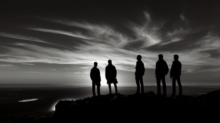 Silhouettes of people gather on a bridge during sunset, creating a serene scene against a fading blue sky transitioning to warm hues.