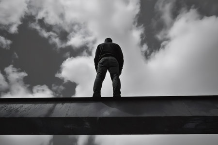 Low angle view of man standing on metal beam against cloudy sky, conveying concepts of courage, challenge, and achievement