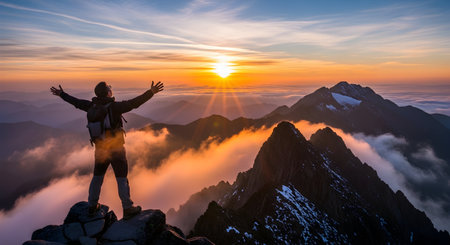 A triumphant hiker stands on a rocky mountain summit with arms wide open, embracing the spectacular view of a mountain range at sunrise. The warm golden light illuminates the peaks and clouds below, conveying feelings of freedom, success, achievement, and adventure. This inspirational scene captures the beauty of nature and the spirit of exploration.