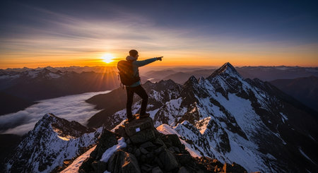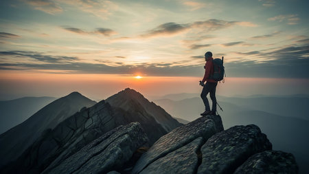 A silhouetted hiker stands triumphantly on a mountain peak, embracing the breathtaking sunrise view. The landscape features majestic mountains and a serene valley below.