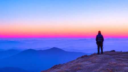 A lone individual stands on a rocky outcrop, gazing at the vibrant sunrise illuminating the mountain landscape with warm hues.