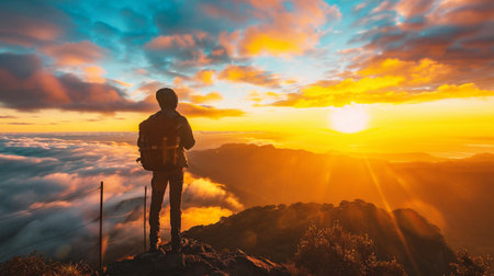 A man stands on a rocky mountain peak, seen from behind, watching a spectacular sunrise. The sun peeks over a sea of clouds, illuminating the sky, while mountain ranges are visible in the distance. This image conveys a sense of achievement, peace, and wonder.