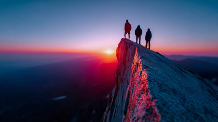 Adventurous hikers standing on mountain cliff at sunrise, symbolizing freedom, exploration, and achievement.