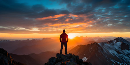 Silhouetted figure gazes at the vibrant sunset from a majestic summit. Concept Landscape Photography, Nature's Beauty, Sunset Views, Mountain Peaks, Silhouette Art