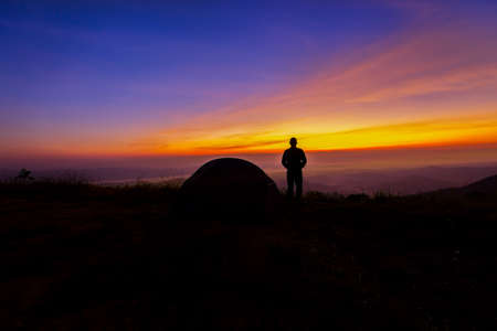 Silhouette of young traveler standing alone on top of the mountain and watched beautiful view of foggy landscape and sunrise in national park. It is a beautiful natural phenomenon in the morning.