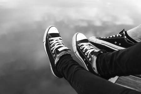 Couples feet in sneakers relaxing by the water. black and white