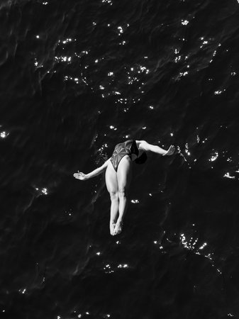 Aquatic pool diving girl action water entry overhead photo.
