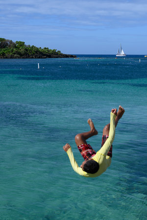 Boy diving into water, West End Village, Roatan, Honduras