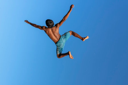 young man jumping in air against blue sky