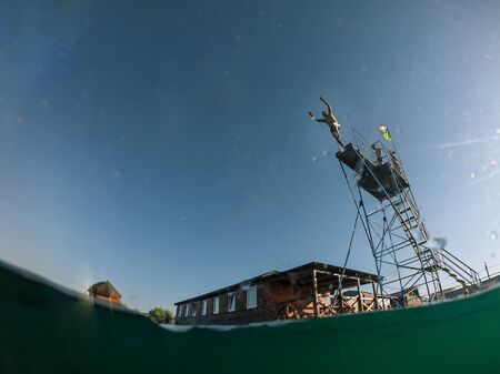 man jumping from tower to lake water copy space summer time